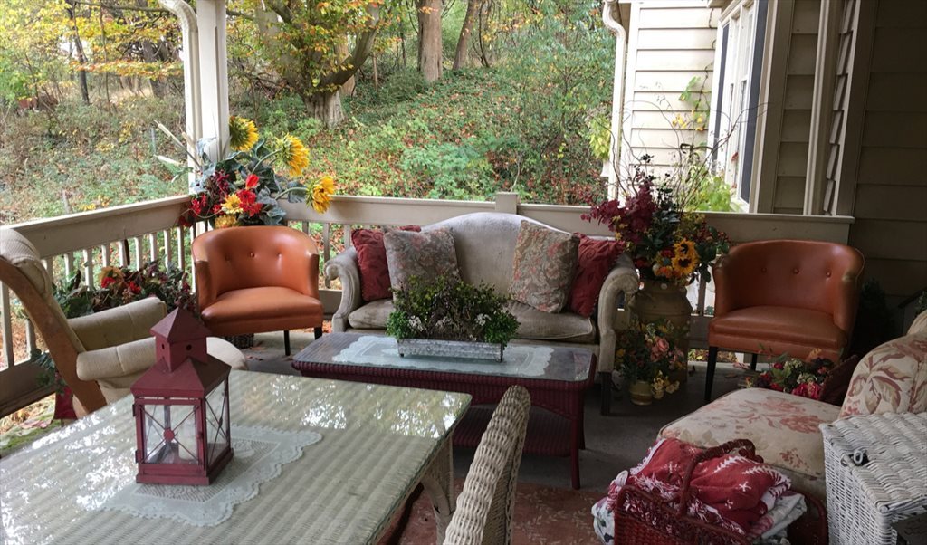 - A cozy covered porch with serene views of the 16 Acre stream valley