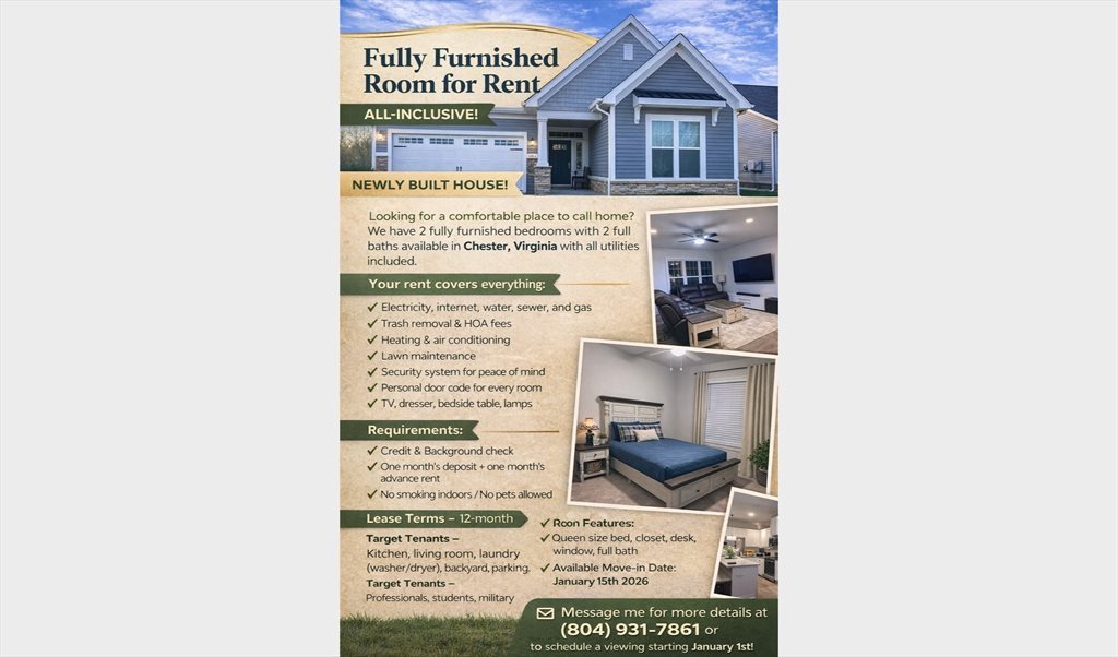 Looking for a comfortable place to call home? We have 2 fully furnished bedrooms with 2 full baths available in Chester, Virginia with all utilities included.