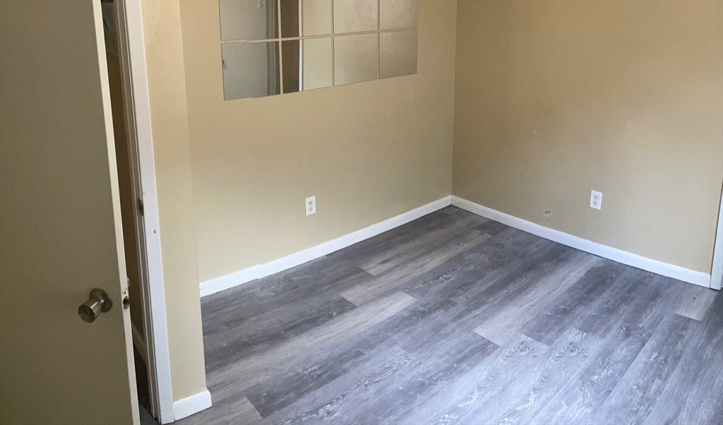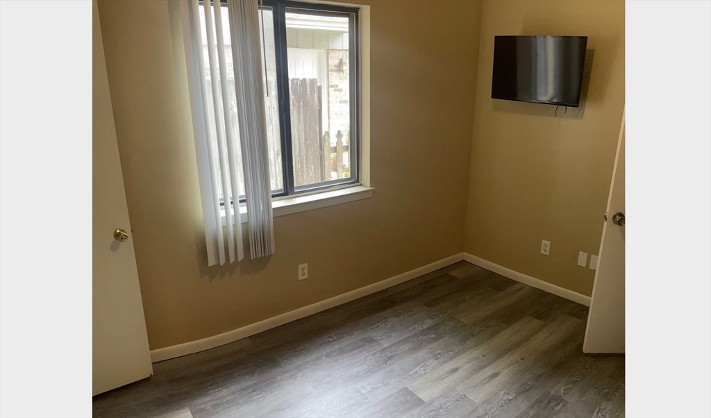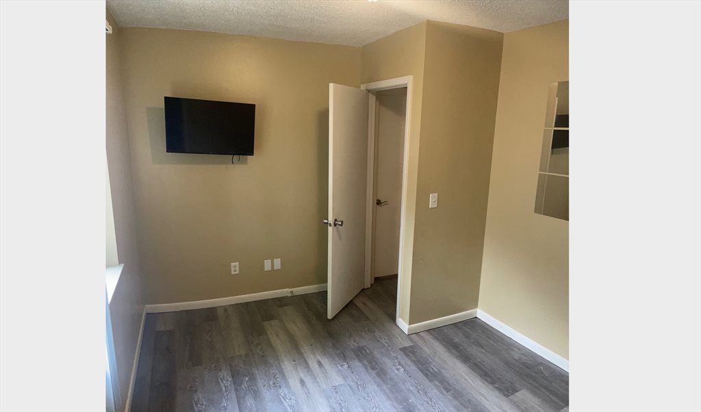 Private room for rent with a shared bathroom. Military friendly! Brand new floor. Room is furnished with small night stand, chair, and TV. No bed. Internet and utilities included.