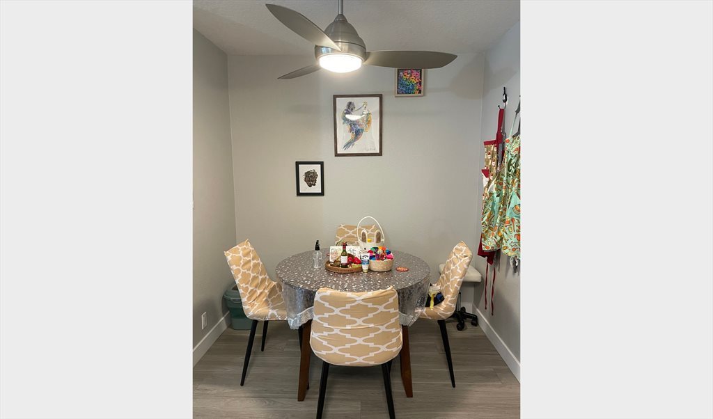 Furnished dining area, mostly furnished living room/kitchen, furnished patio + storage, in unit washing and drying, central heating, dishwasher.