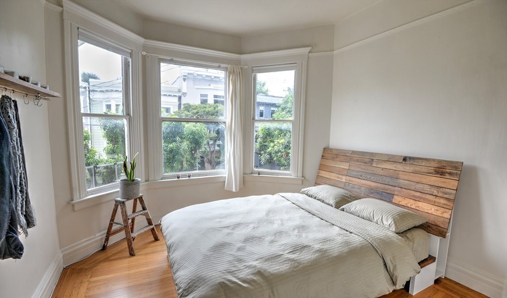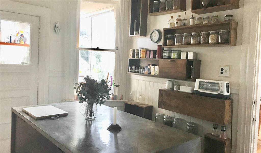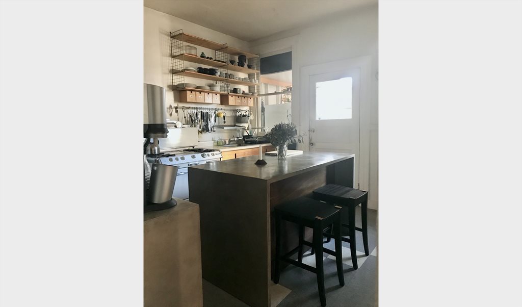The flat is situated half a block from Dolores Park and features mostly hardwood floors. The kitchen features custom reclaimed wood shelving and a handbuilt microcement kitchen island on casters. There is a separate living room/dining area. The house is fully furnished. A clothes washer is available, and we utilize the energy-saving smart dryer (clothesline) or a nearby laundromat.