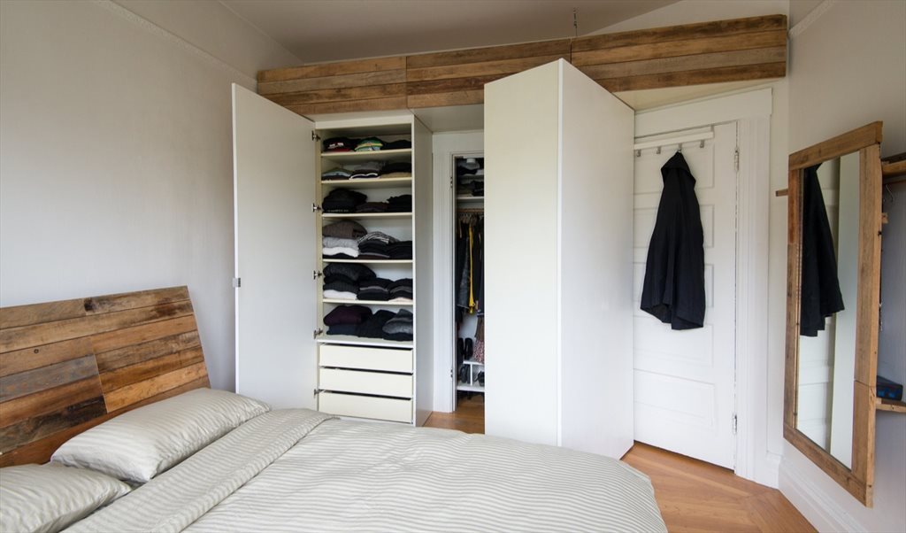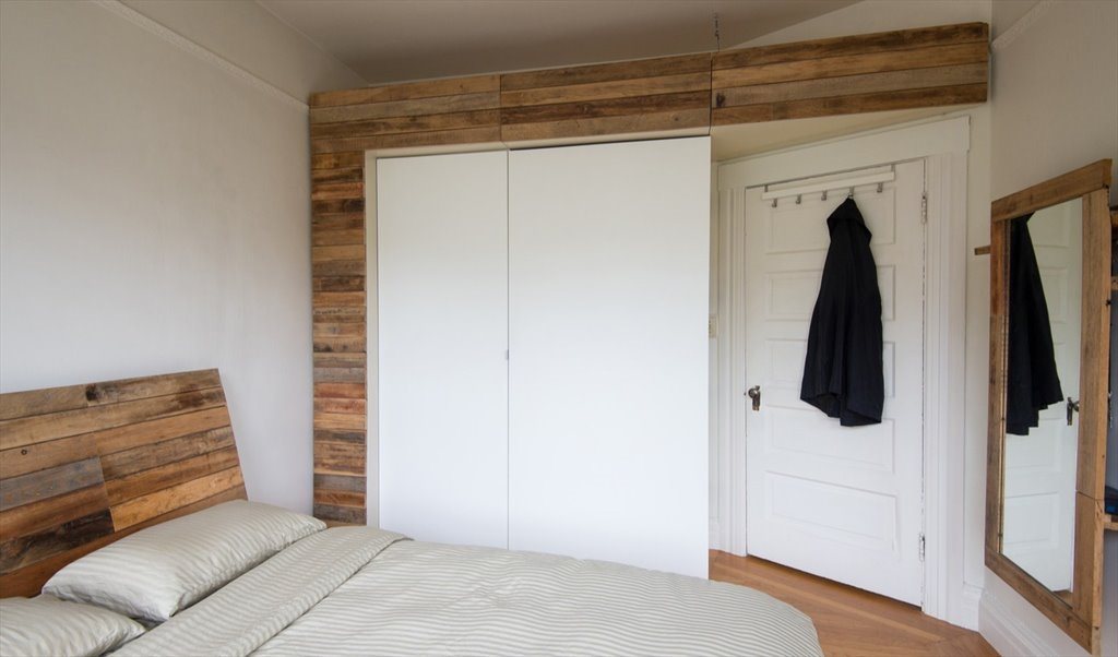 The bedroom is approximately 130 sq.ft., with a custom built-in closet. The closet and headboard are faced with reclaimed oak. It has sunny, south facing bay windows and it comes furnished.