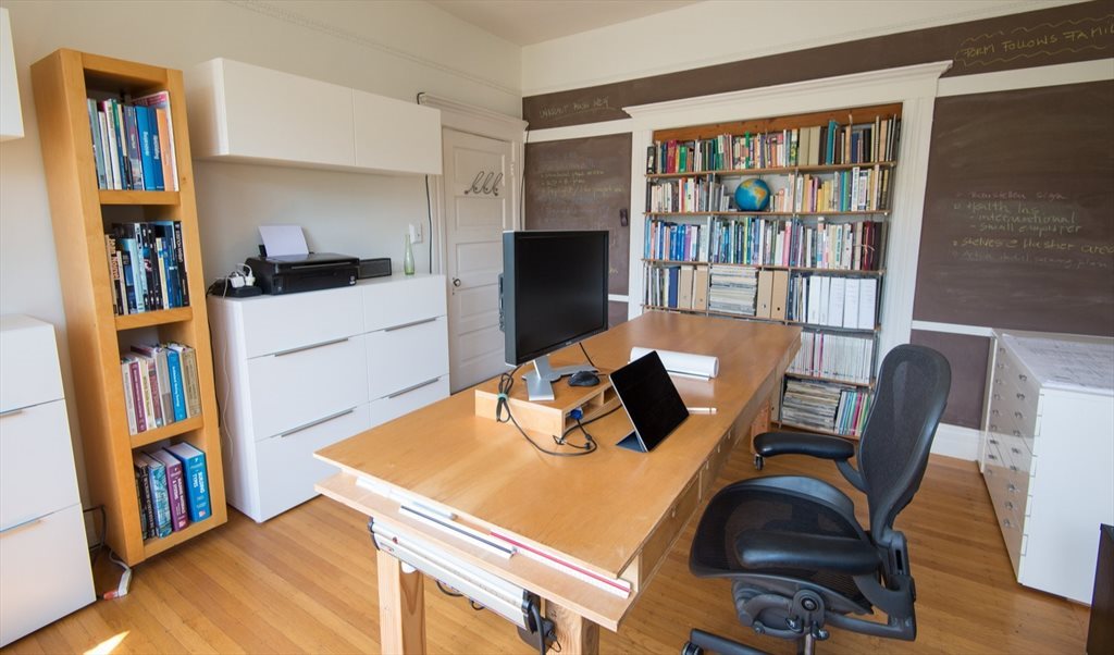 Included for you is the sunny office space. It also has a triple south facing bay window. It features a large custom built desk on casters, printer/scanner/copier, and a chalkboard wall for your thoughts and ideas. A large monitor might be available for you if needed.