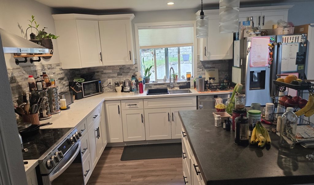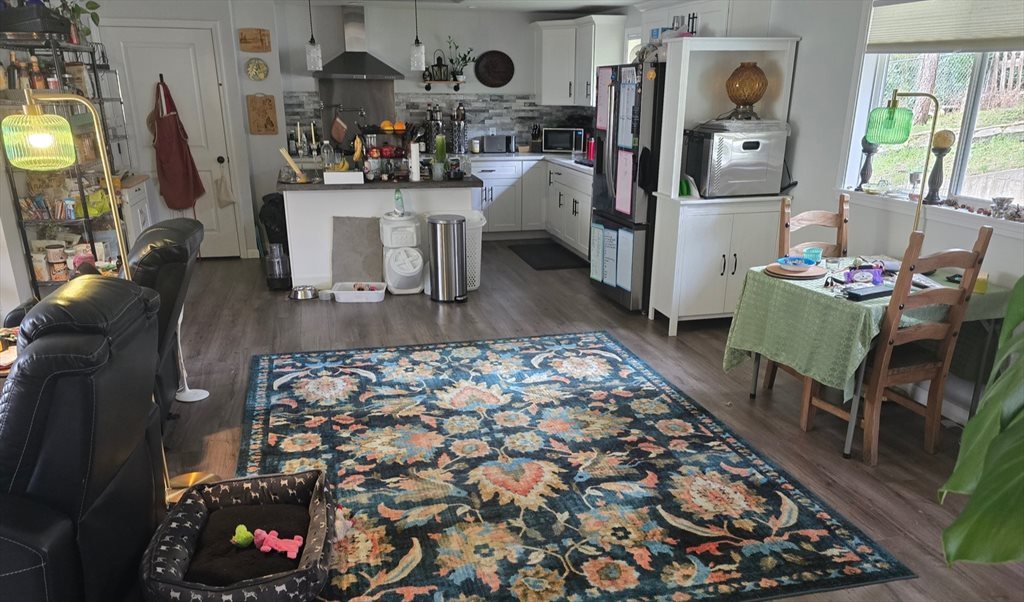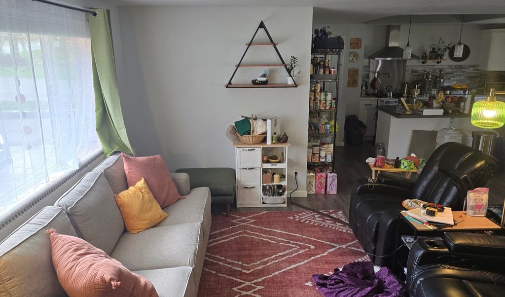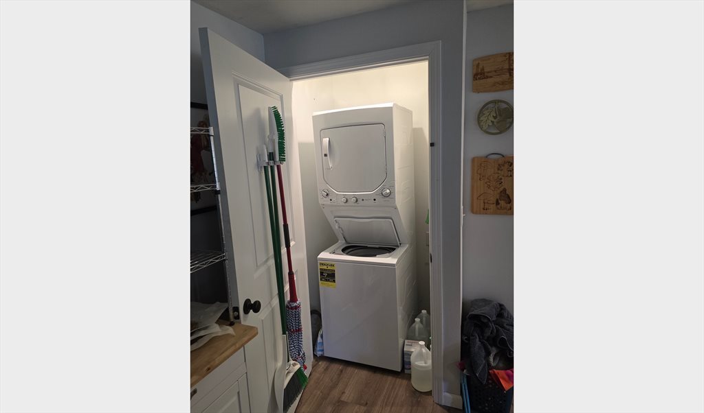 Our large kitchen has an island, an enormous fridge and plenty of storage. Washer, dryer and dishwasher all on site. The living room and dining area are open concept. The home is set back from the street behind a large front yard. The backyard is fenced with a shaded patio. We have a separate storage room, and free off street parking. The home has large windows throughout, filling the space with natural light. We would describe our home as cozy, and our neighborhood as peaceful.