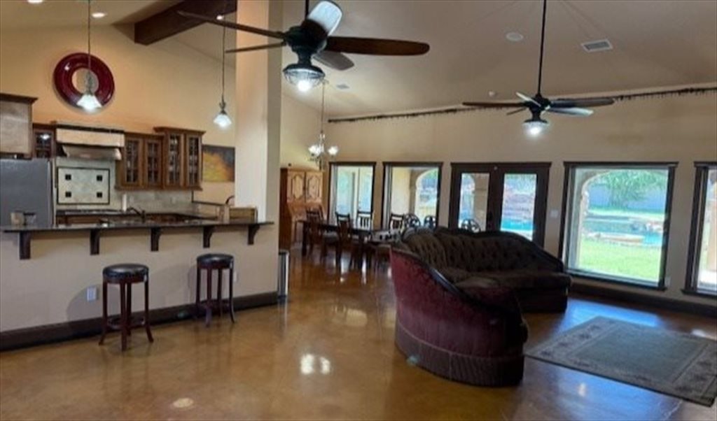 The entertainment building has an 11-speaker theater setup in it as well as two full restrooms with showers. We use it as a theater room / event room / pool house / guest house, etc. We typically set up beds in there when friends and/or family come to visit.