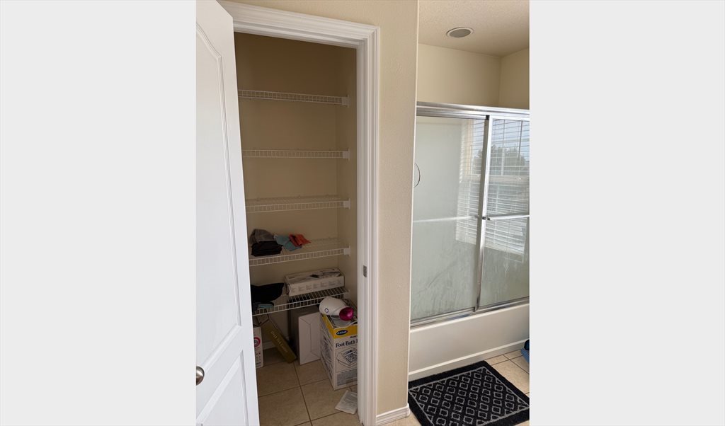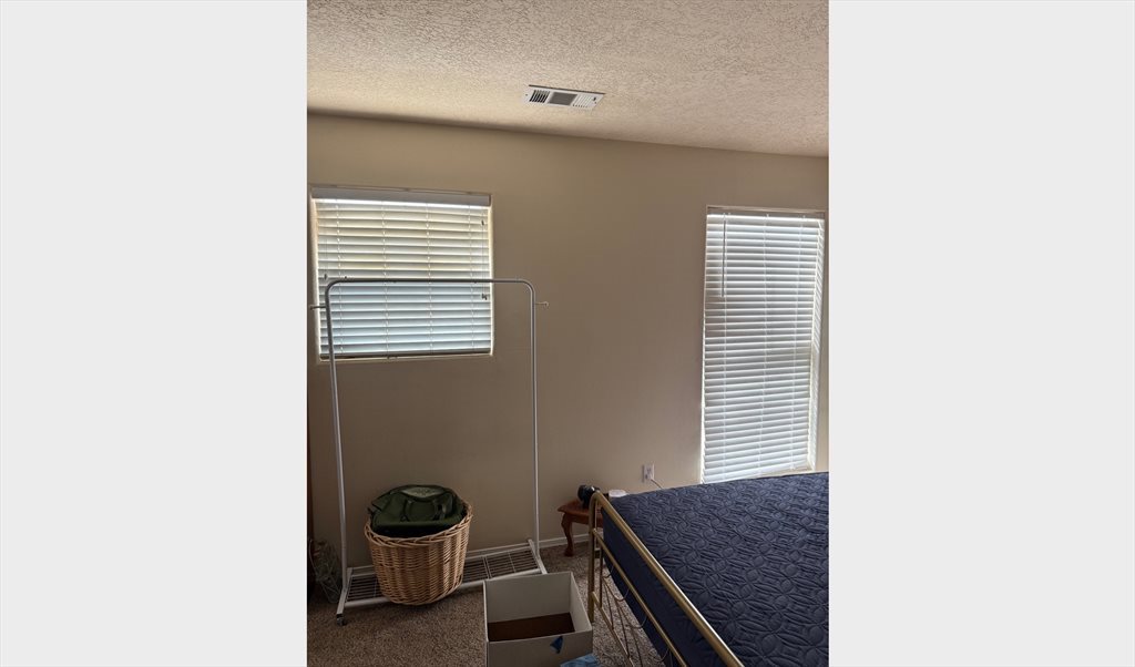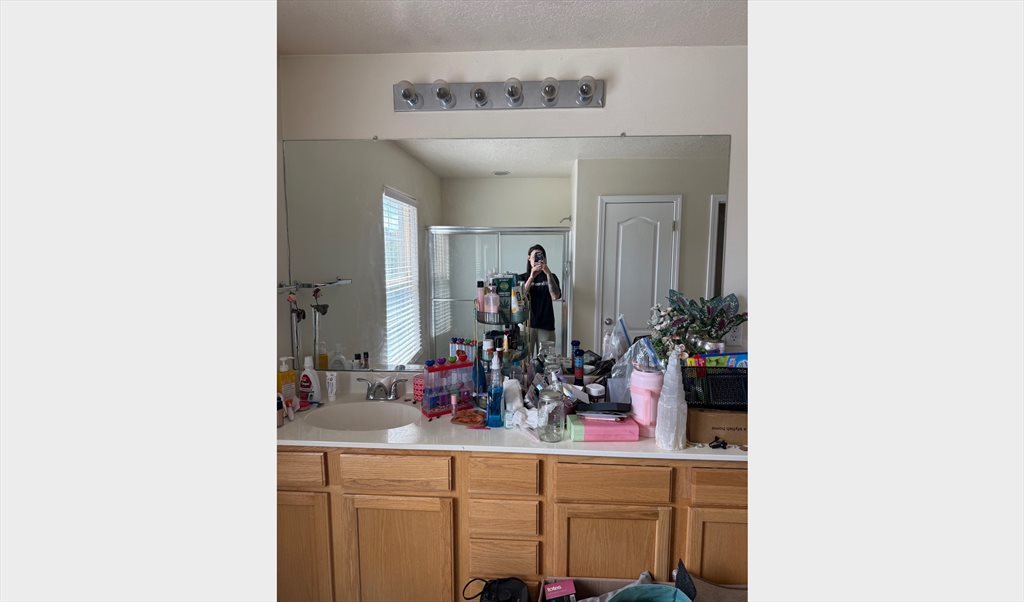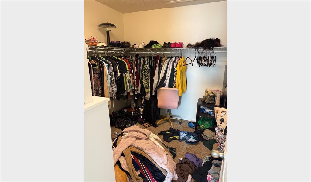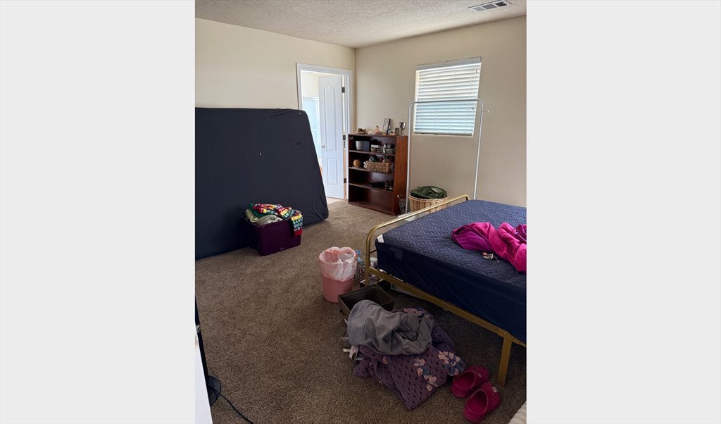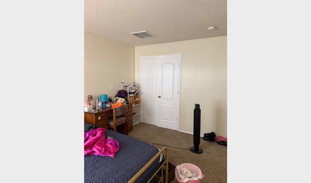 I apologize for the messiness in the photos. I am currently moving out. The room is 200 sq ft, not including the large walk-in closet and ensuite bathroom. Upstairs bedroom next to the upstairs den. The kitchen and living room are downstairs. There is also a small backyard and two car garage. Safe area.